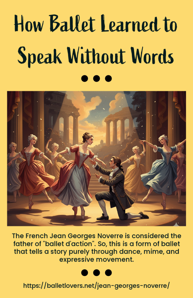Jean Georges Noverre was a French pioneer born in the 18th century. His genius led him to develop a real change in classical ballet. He is considered the father of ballet d’action. So, this is a form of ballet that tells a story purely through dance, mime, and expressive movement.