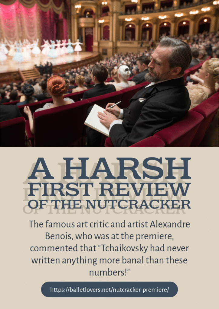 Among the audience was the Russian art critic and artist Alexandre Benois (1870-1960). He would collaborate with the famous Diaghilev Ballet years later. While Sleeping Beauty had fascinated him, The Nutcracker, on the contrary, disappointed him. According to Benois, “CasseNoisette has not turned out to be a success! And it was just in this ballet that I had placed all my hopes, knowing Tchaikovsky’s talent for creating a fairy-tale atmosphere….