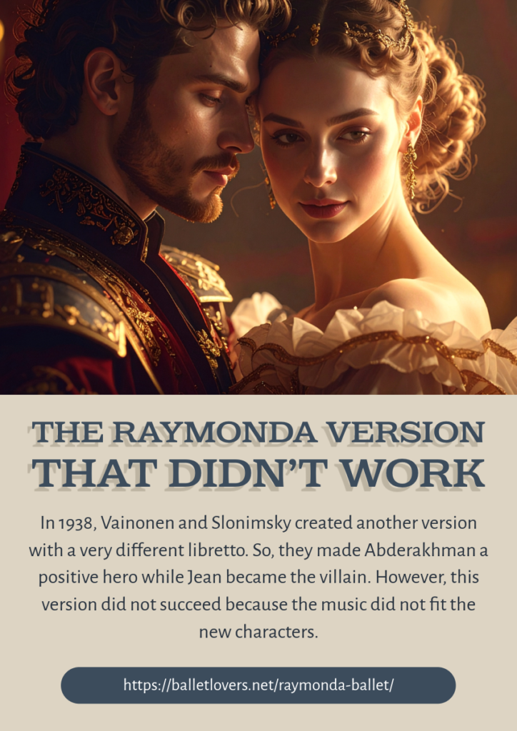 In the Soviet era, Agrippina Vaganova staged a new version in 1931 for the Kirov (then called GATOB). Years later, in 1938, Vasily Vainonen and Yuri Slonimsky created another version with a very different libretto. They switched the order of Acts II and III, moved some variations, added new scenes, and made Abderakhman a positive hero while Jean became the villain. Galina Ulanova played Raymonda. This version did not succeed because the music did not fit the new characters.