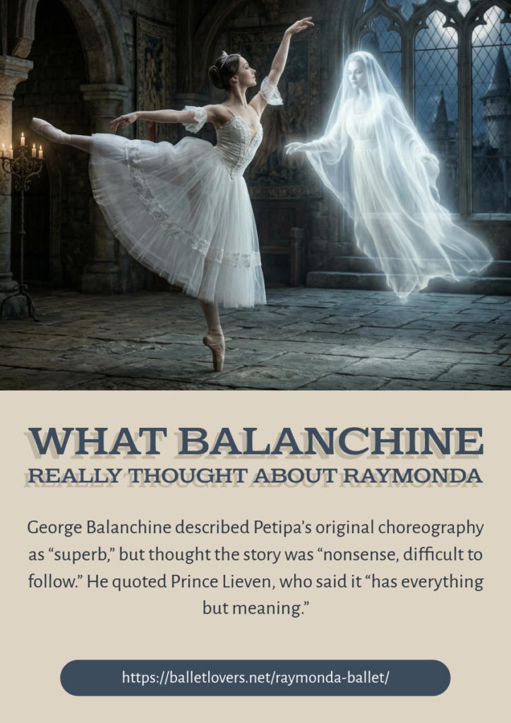George Balanchine described Petipa’s original choreography as “superb,” but thought the story was “nonsense, difficult to follow.” He quoted Prince Lieven, who said it “has everything but meaning.” Balanchine especially admired Glazunov’s music, calling it one of the best for ballet—grand, generous, joyful, and playful—enough to support the dances by itself. His own works, like Raymonda Variations, highlight this musical richness without including the plot.