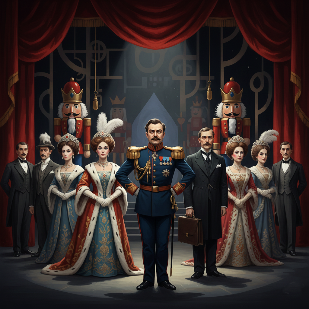 He presented it as a revue of 22 episodes satirising the characters of Imperial Russia. Among the characters were a general with epaulettes, a tsar and tsarina who were the heroine’s parents, a civil servant with a briefcase, a lady-in-waiting, and other vestiges of Tsarist Russia. Lopukhov arbitrarily mixed episodes from the fairy tale with contemporary elements. Also, he used a recitation of Hoffmann’s text to accompany the dances.