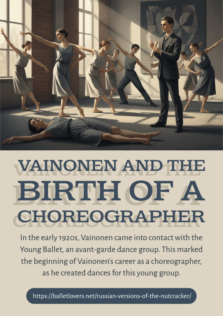 Vasily Vainonen (1901-1964) was a Russian dancer and choreographer who graduated from the Mariinsky Theatre School in 1919. In the early 1920s, Vainonen came into contact with the Young Ballet (Molodoi Balet in Russian), an avant-garde dance group founded by the renowned George Balanchine.