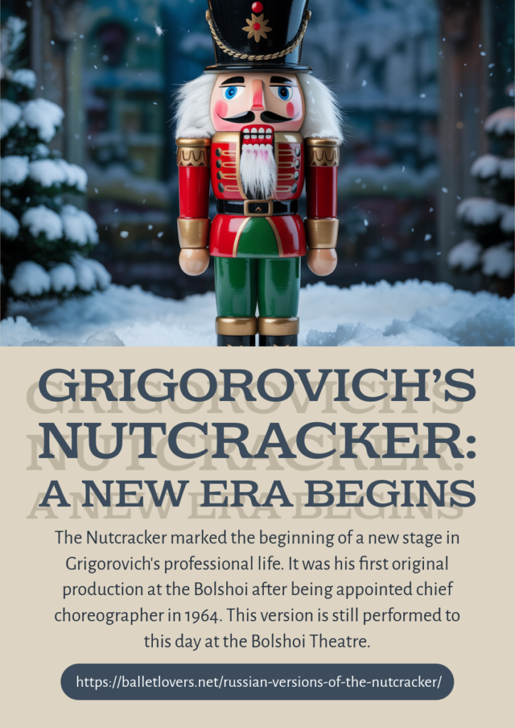 In this way, Yuri Grigorovich presented his version of The Nutcracker for the Bolshoi Ballet of Moscow on March 12, 1966. Since then, it has become an essential work of the Bolshoi and one of its most popular and well-known ballets. Also, the Bolshoi Company presented this ballet in the United States, Great Britain, France, Italy, and other countries.
