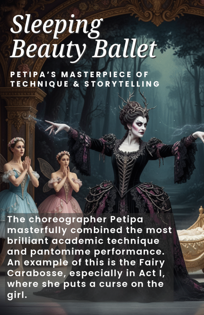 As for the choreography, Petipa masterfully combined the most brilliant academic technique and pantomime performance. An example of this is the Fairy Carabosse, especially in Act I, where she puts a curse on the girl. During the premiere of the ballet, Enrico Cecchetti that role. He also performed the Blue Bird variation.