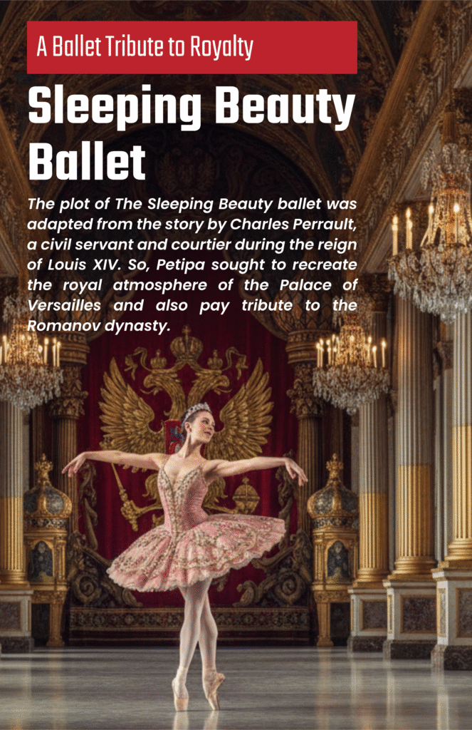 In this article, we want to tell you about the Sleeping Beauty ballet. Marius Petipa (1818-1910) and Piotr Tchaikovsky (1840-1893) created three ballets that would become paradigms of the Russian academic style. Sleeping Beauty was the first collaboration between the French choreographer and the Russian composer. It was made at the request of Prince Ivan Vsevolovski, who had been director of the Imperial Theaters since 1881. The argument was extracted and adapted from the story of Charles Perrault, who was a civil servant and courtier at the time of Louis XIV. Precisely, Petipa and Ivan Vsevolojski wanted to recreate the royal atmosphere of the Palace of Versailles and also pay tribute to the Romanov dynasty. For this reason, the authors created an aristocratic atmosphere for this ballet.