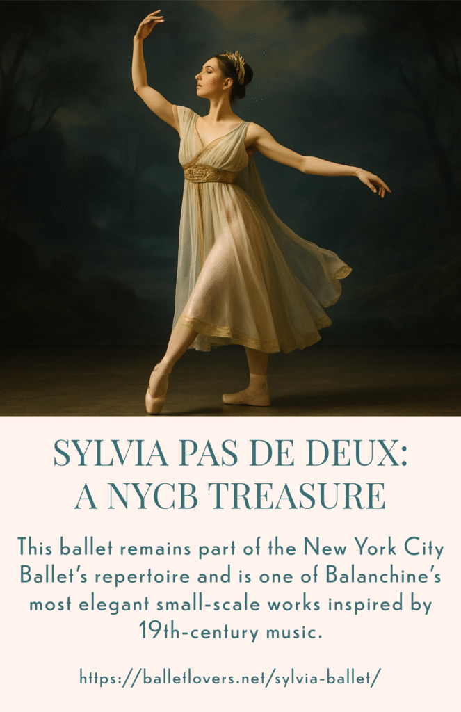 Of course, we must mention Balanchine’s version. The prestigious choreographer George Balanchine (1904-1893) admired Delibes. So, he decided to recreate this ballet in his own way, creating a Pas de Deux for Sylvia. While not a complete staging of the ballet, his pas de deux became an emblematic piece, highly representative of the Romantic era.