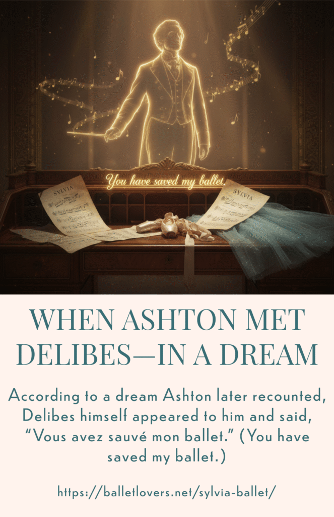 Ashton’s sensitivity to 19th-century ballet music guided his movement style. According to Ashton, “Hearing this 19th-century music, it’s impossible for me… to depart from the spirit of the music.” According to a dream he later recounted, Delibes himself appeared to him and said, “Vous avez sauvé mon ballet.” (You have saved my ballet.)